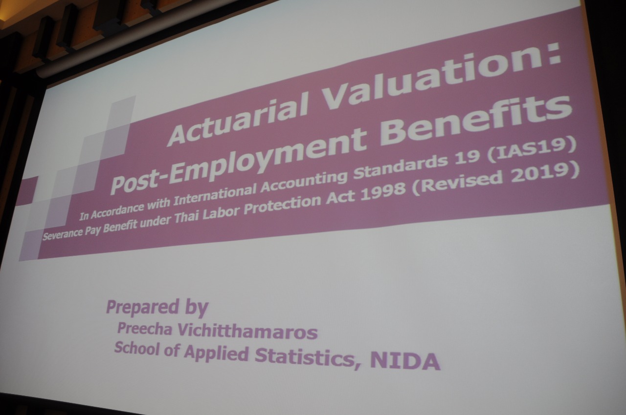 เมื่อวันที่ 26 พฤศจิกายน 2562 สำนักงานคลัง จัดอบรมโครงการ “พัฒนาความรู้ เกี่ยวกับการคำนวณเงินผลประโยชน์ของพนักงาน” ณ ห้องประชุมประภา ประจักษ์ศุภนิติ ชั้น 9 อาคารสำนักงานอธิการบดี โดยได้รับเกียรติจาก ผู้ช่วยศาสตราจารย์ ดร.ปรีชา วิจิตรธรรมรส ผู้อำนวยการศูนย์บริการวิชาการ สถาบันบัณฑิตพัฒน บริหารศาสตร์ เป็นวิทยากรบรรยายให้ความรู้เกี่ยวกับการเตรียมข้อมูลต่าง ๆ วิธีการคำนวณค่าใช้จ่าย และหนี้สิน ตลอดจนเทคนิคการคำนวณผลประโยชน์ของพนักงานตามวิธีคณิตศาสตร์ประกันภัย ตามพระราชบัญญัติคุ้มครองแรงงาน (ฉบับที่ 7) พ.ศ. 2562 และร่วมแลกเปลี่ยนเรียนรู้เกี่ยวกับสถานการณ์ที่เปลี่ยนแปลงไป ทั้งนี้มีบุคคลากรที่สนใจเข้าร่วมอบรม ประมาณ 50 คน [ขอขอบคุณภาพถ่ายจาก คุณพจน์เมธี โคตรสุโพธิ์ สำนักงานมหาวิทยาลัยสัมพันธ์]