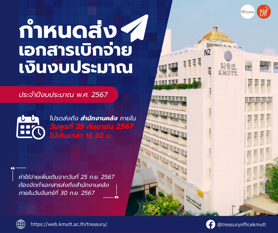 1. จัดทำเอกสารเบิกส่งถึงสำนักงานคลังภายในวันพุธที่ 25 กันยายน 2567 ไม่เกินเวลา 16.30 น.