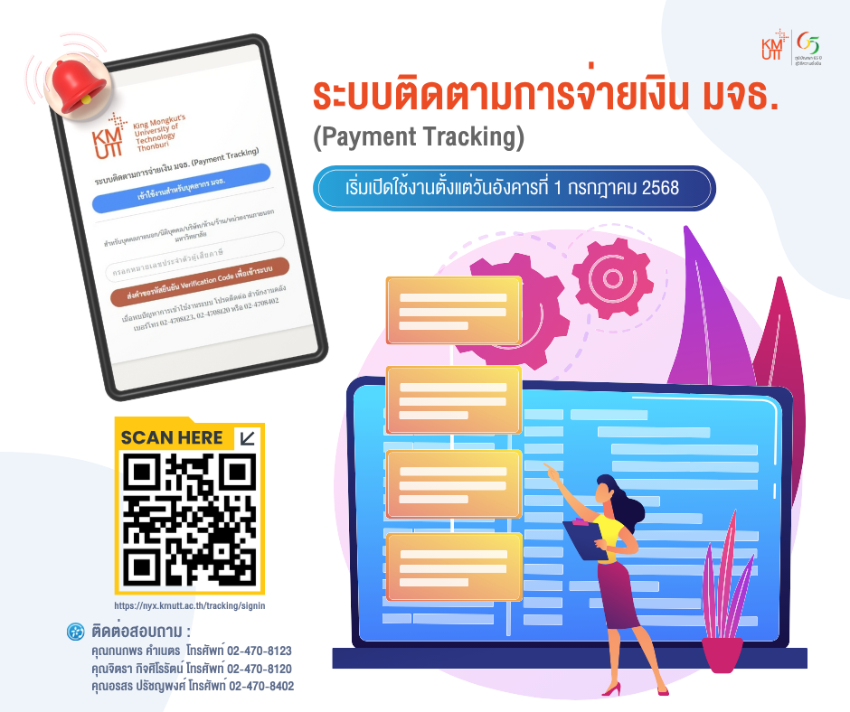 เพื่อยกระดับความโปร่งใสในการให้บริการด้านการเงิน และเพื่ออำนวยความสะดวกแก่ผู้รับบริการทุกกลุ่ม อาทิ บุคลากรมหาวิทยาลัย บุคคลภายนอก บริษัท ห้างร้าน และหน่วยงานภายนอก สำนักงานคลัง มจธ. ได้พัฒนา ระบบติดตามการจ่ายเงิน (Payment Tracking) ซึ่งเปิดโอกาสให้ผู้รับบริการสามารถตรวจสอบสถานะ การเบิกจ่ายเงินของตนเองได้อย่างรวดเร็ว สะดวก และปลอดภัยระบบดังกล่าวจะเปิดใช้งานตั้งแต่วันอังคารที่ 1 กรกฎาคม 2568 โดยสามารถเข้าใช้งานระบบ ผ่านช่องทาง ดังนี้