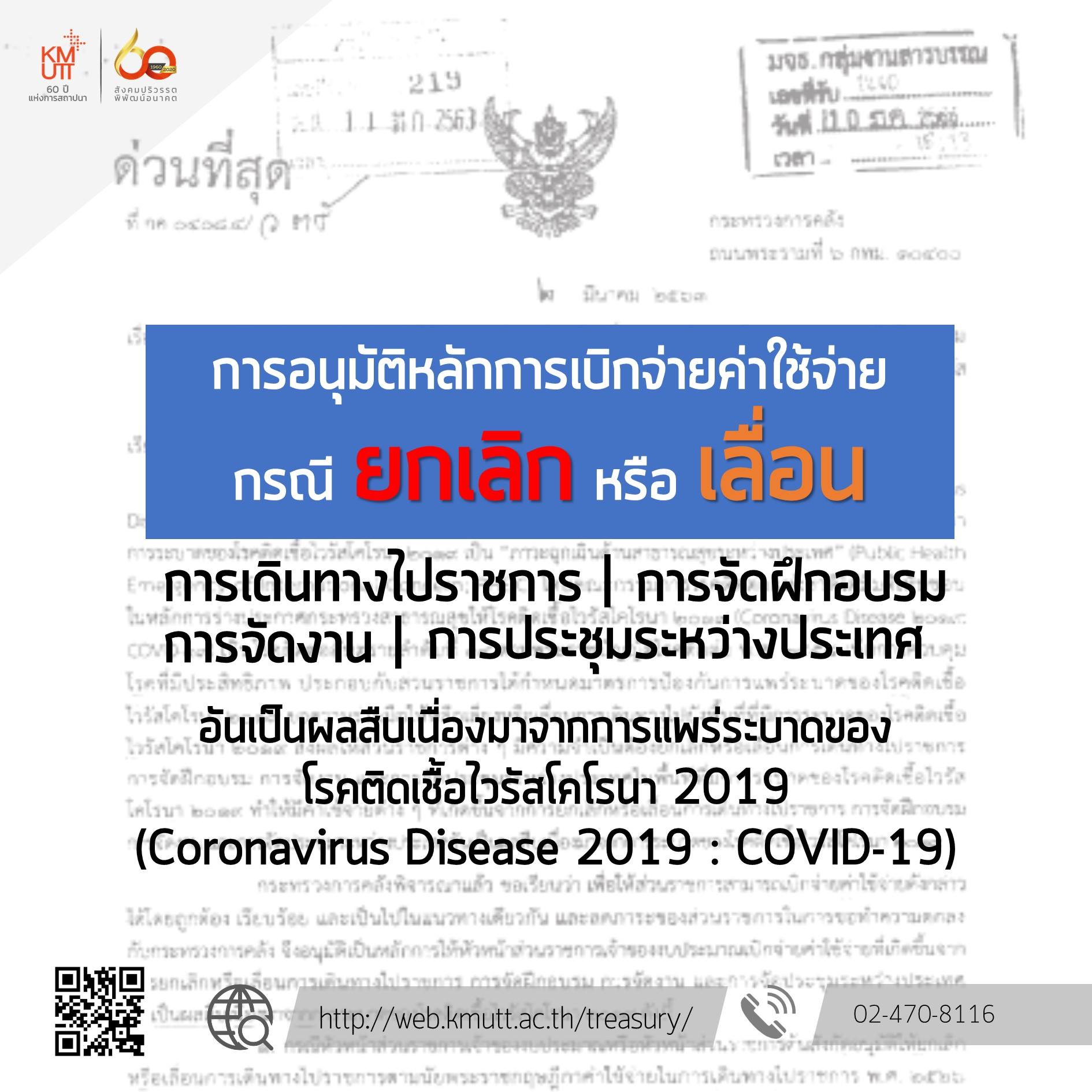 สำนักงานคลังขอแจ้งหนังสือกระทรวงการคลัง ด่วนที่สุด ที่ กค 0408.4/ว 35 ลงวันที่ 2 มีนาคม 2563 เรื่อง การอนุมัติหลักการเบิกจ่ายค่าใช้จ่ายกรณียกเลิกหรือเลื่อนการเดินทางไปราชการ การจัดฝึกอบรม การจัดงาน และการประชุมระหว่างประเทศ อันเป็นผลสืบเนื่องมาจากการแพร่ระบาดของโรคติดเชื้อไวรัสโคโรนา 2019 (Coronavirus Disease 2019 : COVID-19) โดยอนุมัติเป็นหลักการให้หัวหน้าส่วนราชการเจ้าของงบประมาณเบิกจ่ายค่าใช้จ่ายที่เกิดขึ้นจากการยกเลิกหรือเลื่อนการเดินทางไปราชการ การจัดฝึกอบรม การจัดงาน และการประชุมระหว่างประเทศ อันเป็นผลสืบเนื่องมาจากการแพร่ระบาดของโรคติดเชื้อไวรัสโคโรนา 2019 ในกรณีต่าง ๆ ตามรายละเอียดที่แจ้งในหนังสือ ได้เท่าที่จ่ายจริง ตามความจำเป็น เหมาะสม และประหยัด เพื่อประโยชน์ของทางราชการ โดยให้อยู่ในดุลยพินิจของหัวหน้าส่วนราชการเจ้าของงบประมาณ
