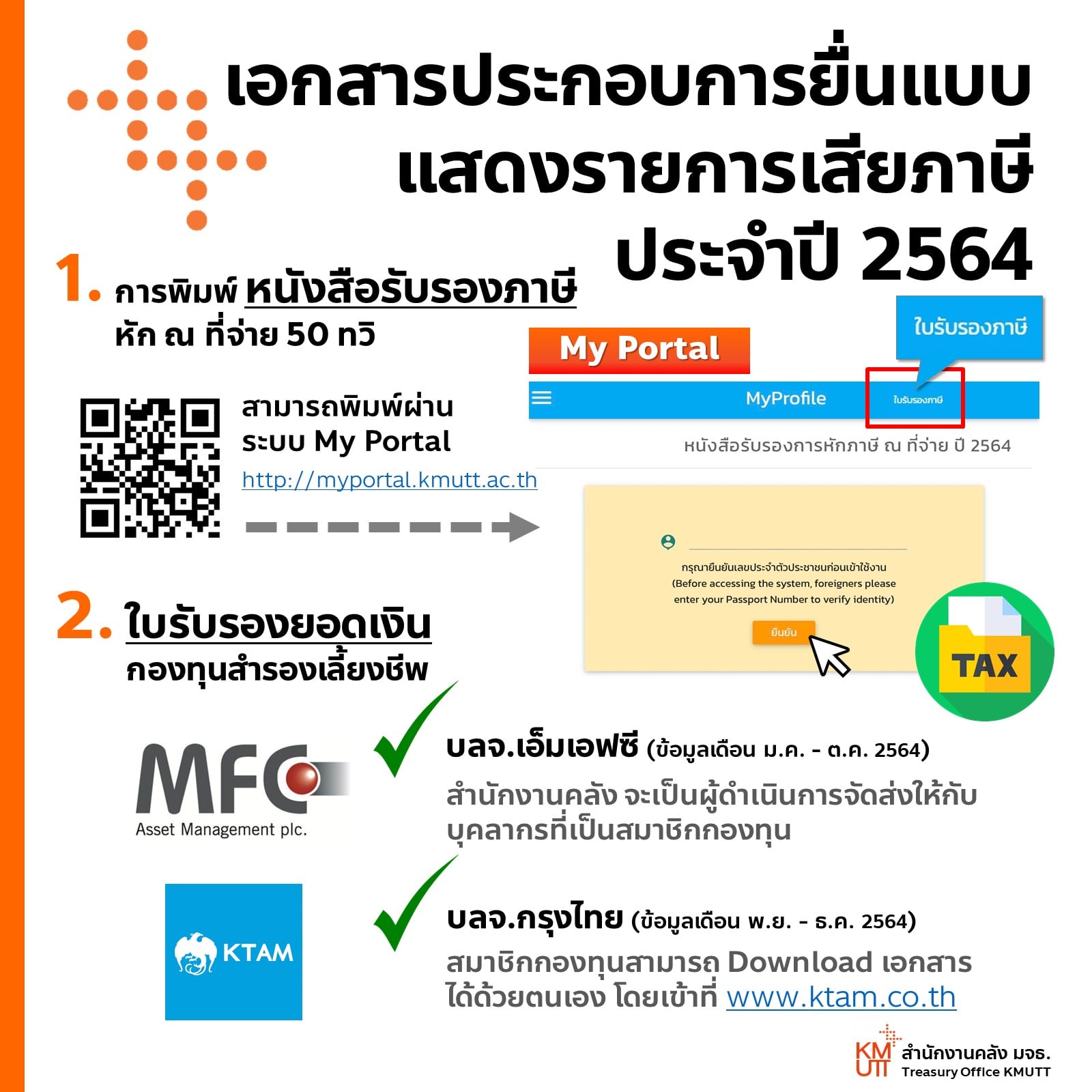 1. หนังสือรับรองภาษีหัก ณ ที่จ่าย 50 ทวิ บุคลากรสามารถพิมพ์ผ่านระบบ My Portal โดยเข้าที่ https://myprotal.kmutt.ac.th จากนั้นเลือก My Profile (ใหม่) หัวข้อหนังสือรับรองภาษี แล้วสั่งพิมพ์ด้วยตนเอง (ในส่วนเงินกองทุนสำรองเลี้ยงชีพปี 2564 ได้แสดงจำนวนเงินอยู่ในหนังสือรับรองภาษีหัก ณ ที่จ่าย50 ทวิ เรียบร้อยแล้ว)