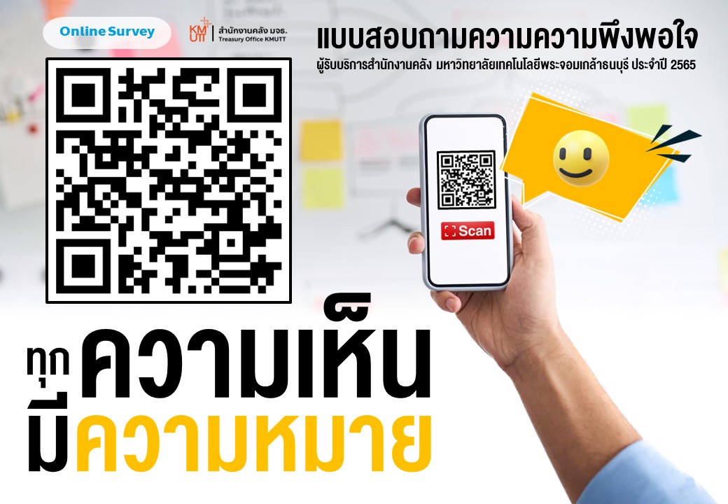 สำนักงานคลัง มหาวิทยาลัยเทคโนโลยีพระจอมเกล้าธนบุรี ขอความอนุเคราะห์จากท่านในการตอบแบบสอบถาม เพื่อประเมินความพึงพอใจของผู้รับบริการที่มีต่อสำนักงานคลัง ประจำปีงบประมาณ พ.ศ. 2565 เพื่อนำผลที่ได้รับจากการประเมินไปพัฒนาการให้บริการที่ดีแก่ผู้รับบริการ ที่ Link : https://forms.office.com/r/LQaSj1h11j หรือ สแกน QR Code นี้