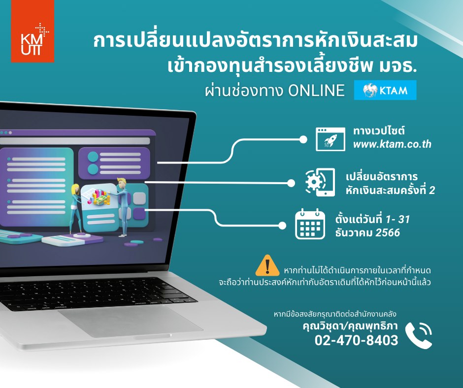 ดังนั้น เพื่อให้เป็นไปตามข้อบังคับฯ การยืนยันอัตราการหักเงินสะสมจากเงินค่าจ้างของท่านเข้ากองทุนฯ ท่านสามารถเข้าไปเปลี่ยนอัตราการหักเงินสะสมครั้งที่ 2 ทาง Online ผ่าน www.ktam.co.th ตั้งแต่วันที่ 1- 31 ธันวาคม 2566 หากท่านไม่ได้ดำเนินการภายในเวลาที่กำหนด จะถือว่าท่านประสงค์หักเท่ากับอัตราเดิมที่ได้หักไว้ก่อนหน้านี้แล้ว ทั้งนี้ ท่านสามารถศึกษาคู่มือการเข้าใช้งานการเปลี่ยนแปลงอัตราเงินสะสม (ตามเอกสารแนบท้าย)