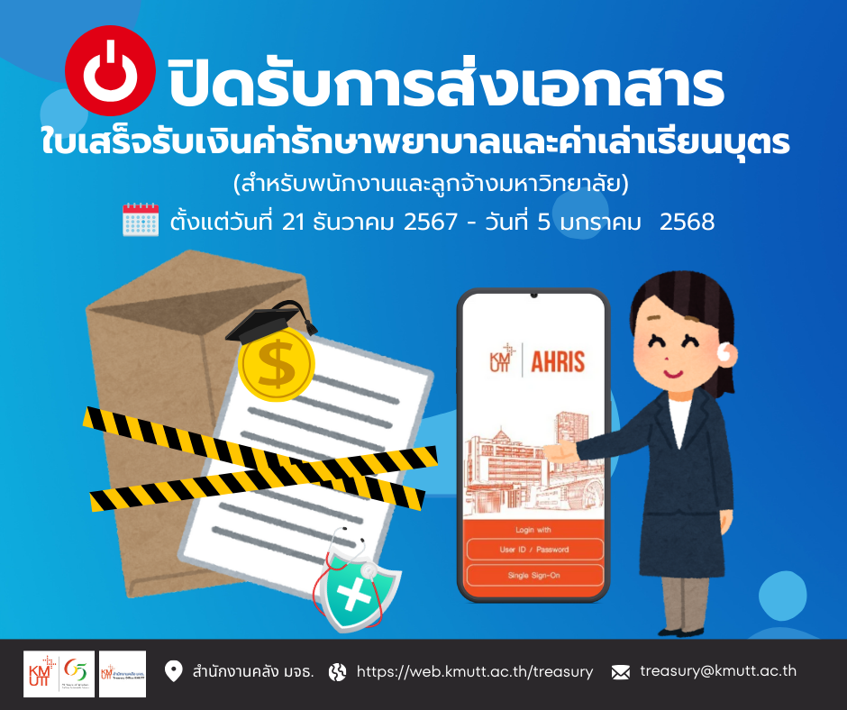 ทั้งนี้เพื่อให้การดำเนินการดังกล่าวเป็นไปตามแผนการดำเนินการ และข้อมูลในระบบ AHRIS มีความถูกต้องและสอดคล้องกับปัจจุบัน สำนักงานคลังจึงขอรับเอกสารใบเสร็จรับเงินค่ารักษาพยาบาล และค่าเล่าเรียนบุตร ถึงวันที่ 20 ธันวาคม 2567 และขออนุญาตปิด/งดรับเอกสารใบเสร็จรับเงิน ค่ารักษาพยาบาลและค่าเล่าเรียนบุตร (เป็นการชั่วคราว) ตั้งแต่วันที่ 21 ธันวาคม 2567 – วันที่ 5 มกราคม 2568 เพื่อดำเนินการเบิกจ่ายเงินสวัสดิการ และนำเข้าข้อมูลทั้งหมดเข้าระบบ AHRIS