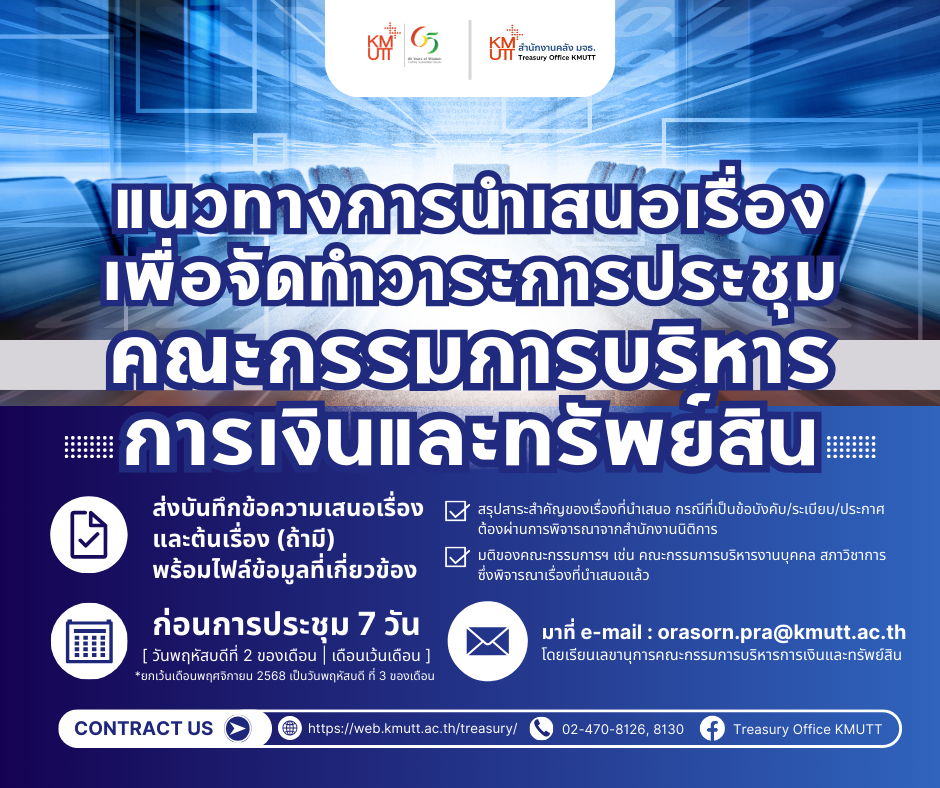 - ส่งบันทึกข้อความเสนอเรื่องและต้นเรื่อง (ถ้ามี) โดยเรียนเลขานุการคณะกรรมการบริหารการเงินและทรัพย์สิน ส่งมาที่สำนักงานคลัง พร้อมไฟล์ข้อมูลที่เกี่ยวข้องมาที่ e-mail : Orasorn.pra@kmutt.ac.th ภายในวันที่กำหนด (ดังเอกสารแนบ) กรณีเกินกำหนดขอนำเสนอในเดือนถัดไป