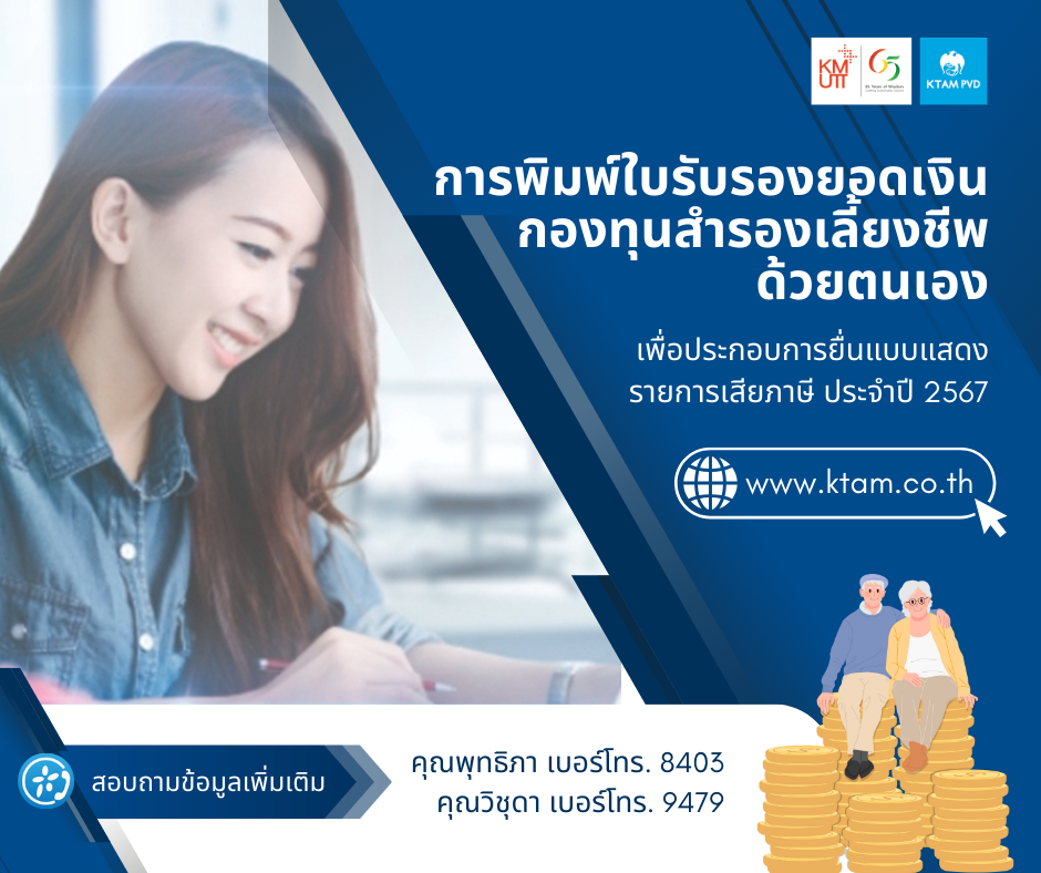 สมาชิกกองทุนสำรองเลี้ยงชีพสามารถ Download เอกสารใบรับรองยอดเงินกองทุนสำรองเลี้ยงชีพ ปี 2567 ได้ด้วยตนเอง โดยเข้าที่ www.ktam.co.th (ตามคู่มือที่แนบ)