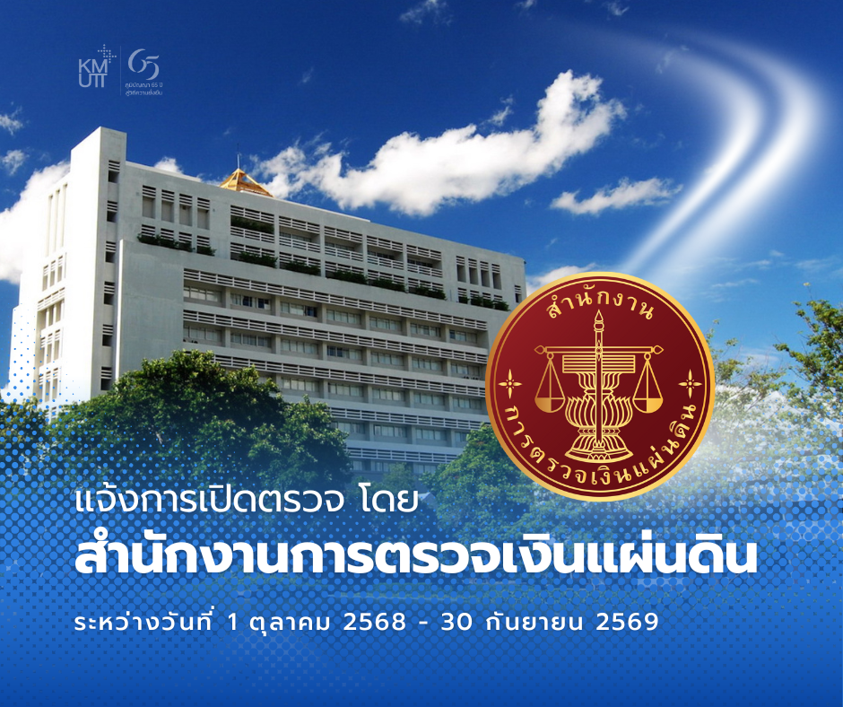 สำนักงานคลัง มจธ. ขอแจ้งเวียนหนังสือของสำนักงานการตรวจเงินแผ่นดิน ที่ ตผ 00472/9988 ลงวันที่ 8 ตุลาคม 2568 เรื่อง แจ้งการเปิดตรวจ ด้วยผู้ว่าการตรวจเงินแผ่นดิน โดยสำนักตรวจสอบการเงินและบริหารพัสดุที่ 22 มีกำหนดจะเข้าตรวจสอบรายงานการเงินของมหาวิทยาลัยเทคโนโลยีพระจอมเกล้าธนบุรี สำหรับปีสิ้นสุดวันที่ 30 กันยายน 2568 ตามพระราชบัญญัติประกอบรัฐธรรมนูญว่าด้วยการตรวจเงินแผ่นดิน พ.ศ. 2561 ตั้งแต่วันที่ 1 ตุลาคม 2568 ถึงวันที่ 30 กันยายน 2569