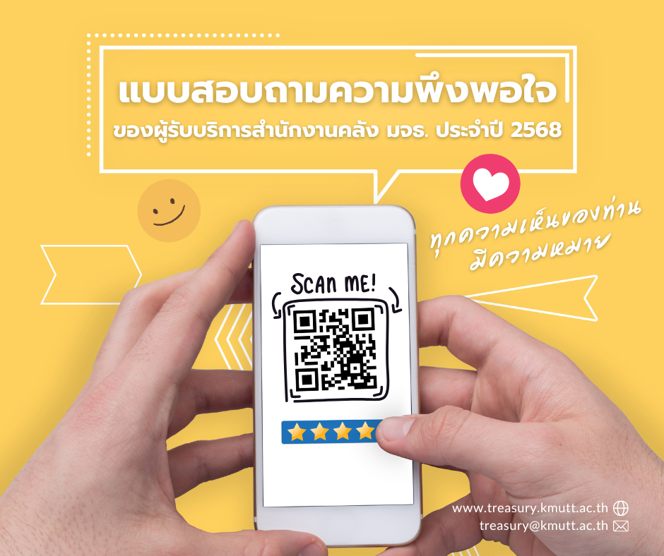 สำนักงานคลัง มหาวิทยาลัยเทคโนโลยีพระจอมเกล้าธนบุรี ขอความอนุเคราะห์จากท่านในการตอบแบบสอบถาม เพื่อประเมินความพึงพอใจของผู้รับบริการที่มีต่อสำนักงานคลัง ประจำปีงบประมาณ พ.ศ. 2568 เพื่อนำผลที่ได้รับจากการประเมินไปพัฒนาการให้บริการที่ดีแก่ผู้รับบริการ ที่ Link : https://kmutt.me/trosurvey2025 หรือ สแกน QR Code นี้