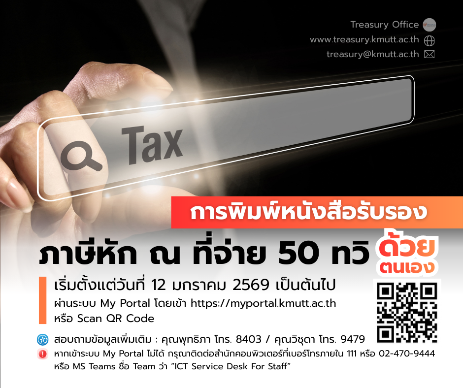 บุคลากรสามารถจัดพิมพ์หนังสือรับรองภาษีหัก ณ ที่จ่าย 50 ทวิ ผ่านระบบ My Portal โดยเข้า https://myportal.kmutt.ac.th หรือ Scan QR Code ที่ปรากฏด้านล่างแล้วกรอกรายละเอียดเพื่อเข้าสู่ระบบฯ จากนั้นเลือก My Profile หัวข้อ “ใบรับรองภาษี” แล้วสั่งพิมพ์ด้วยตนเอง ทั้งนี้เริ่มตั้งแต่วันที่ 12 มกราคม 2569 เป็นต้นไป (ในส่วนเงินสะสมกองทุนสำรองเลี้ยงชีพปี 2568 ได้แสดงจำนวนเงินอยู่ในหนังสือรับรองภาษีหัก ณ ที่จ่าย 50 ทวิ เรียบร้อยแล้ว)