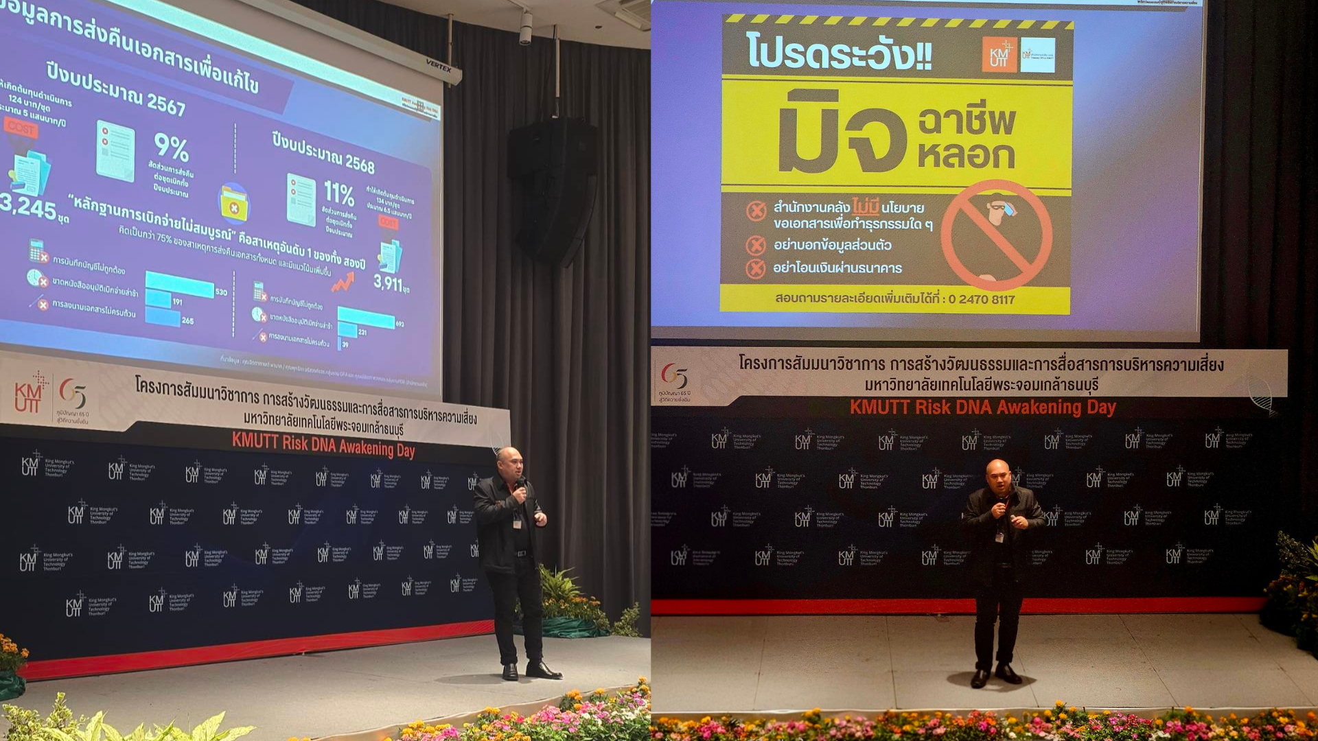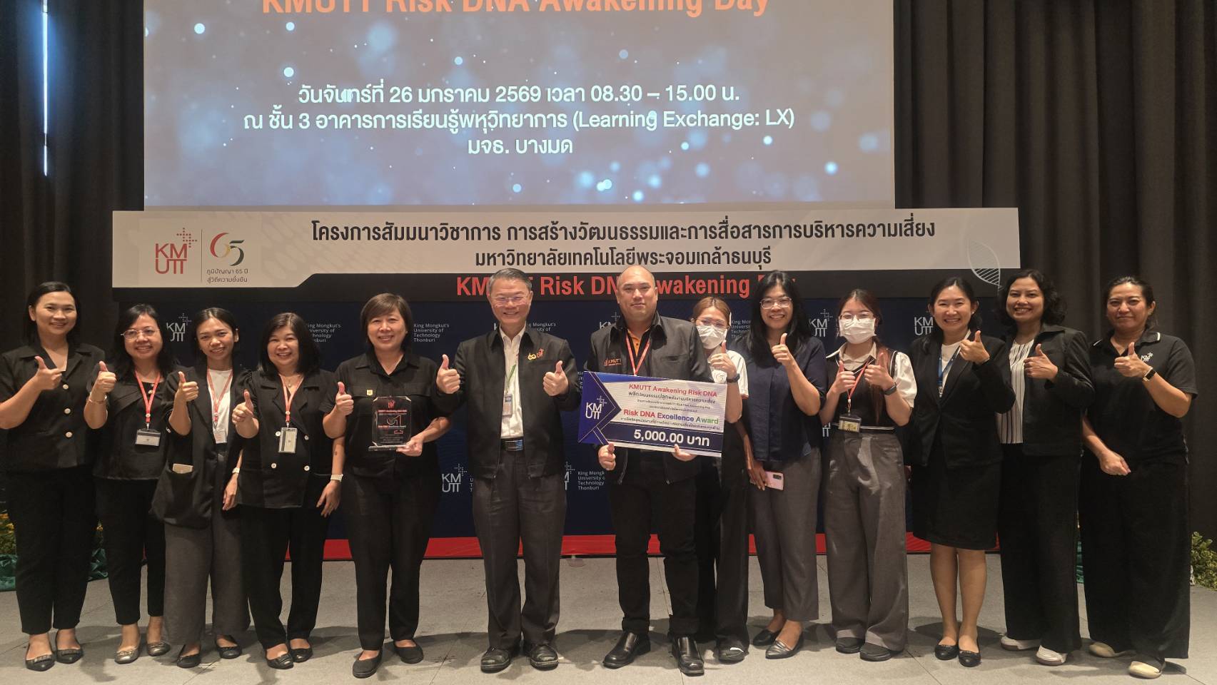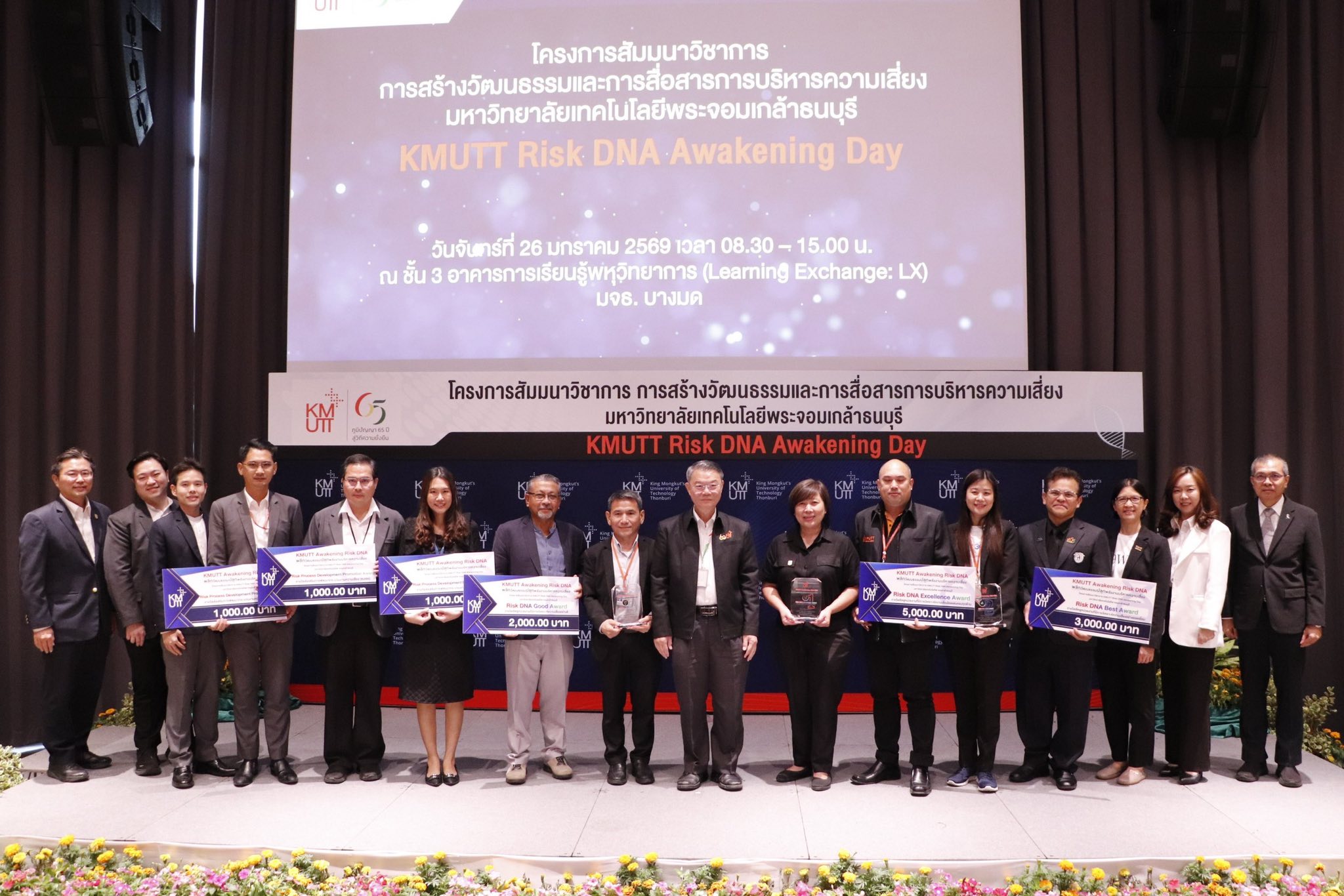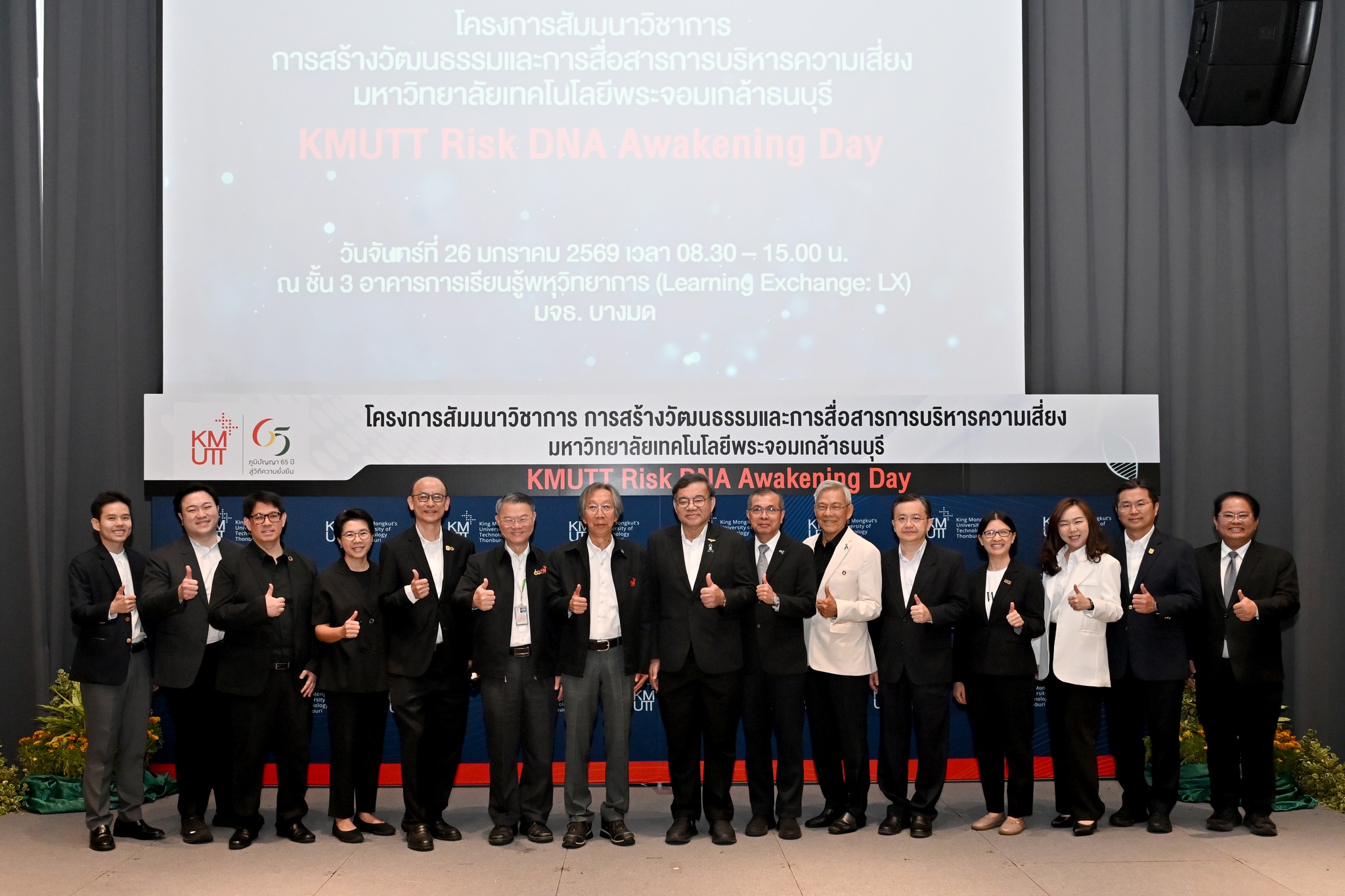 เมื่อวันที่ 26 มกราคม พ.ศ. 2569 มหาวิทยาลัยเทคโนโลยีพระจอมเกล้าธนบุรี จัดโครงการสัมมนาวิชาการ “KMUTT Risk DNA Awakening Day” ณ ห้อง Auditorium ชั้น 3 อาคารพหุวิทยาการ (LX) โดยมีวัตถุประสงค์เพื่อสร้างความตระหนักรู้และเสริมสร้างความเข้าใจด้านการบริหารความเสี่ยงในระดับองค์กรอย่างเป็นระบบในการนี้ได้รับเกียรติจาก ผู้ช่วยศาสตราจารย์ประเสริฐ คันธมานนท์ รองอธิการบดีอาวุโสฝ่ายบริหาร กล่าวรายงานวัตถุประสงค์ของการจัดงาน และ รองศาสตราจารย์ ดร.สุวิทย์ แซ่เตีย อธิการบดี เป็นประธานกล่าวเปิดงาน พร้อมทั้งรับฟังปาฐกถาในหัวข้อ “การสร้างวัฒนธรรมและการสื่อสารด้านการบริหารความเสี่ยง” โดย คุณสมประสงค์ บุญยะชัย ประธานกรรมการบริหารความเสี่ยง มจธ.