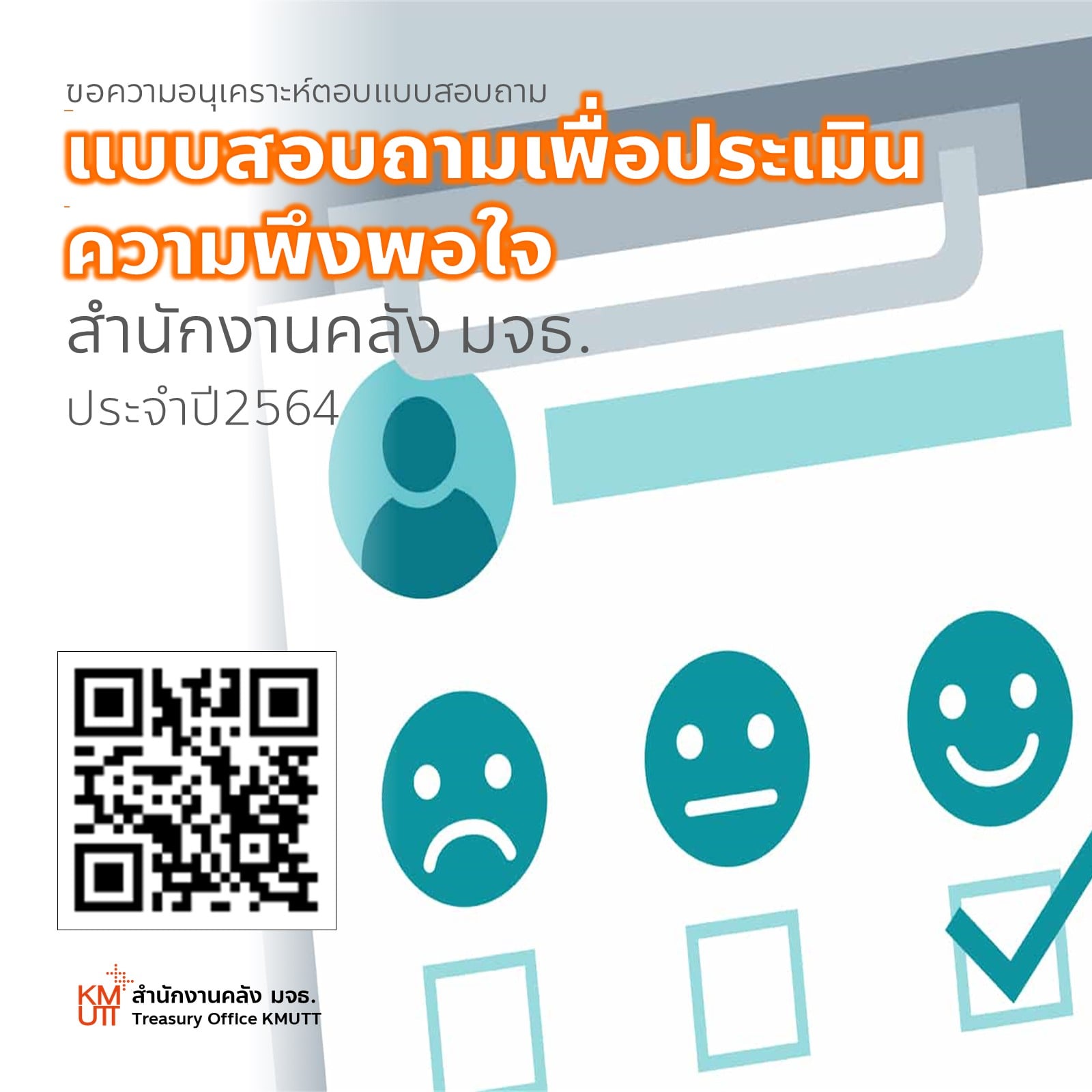 ขอความอนุเคราะห์ตอบแบบสอบถามเพื่อประเมินความพึงพอใจของผู้รับบริการที่มีต่อ สำนักงานคลัง มหาวิทยาลัยเทคโนโลยีพระจอมเกล้าธนบุรี ประจำปีงบประมาณ พ.ศ. 2564